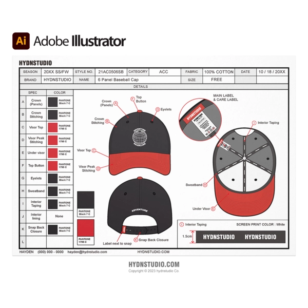 스냅백 모자 디자인을 위한 작업지시서 세트 / 패션 작업지시서 양식
